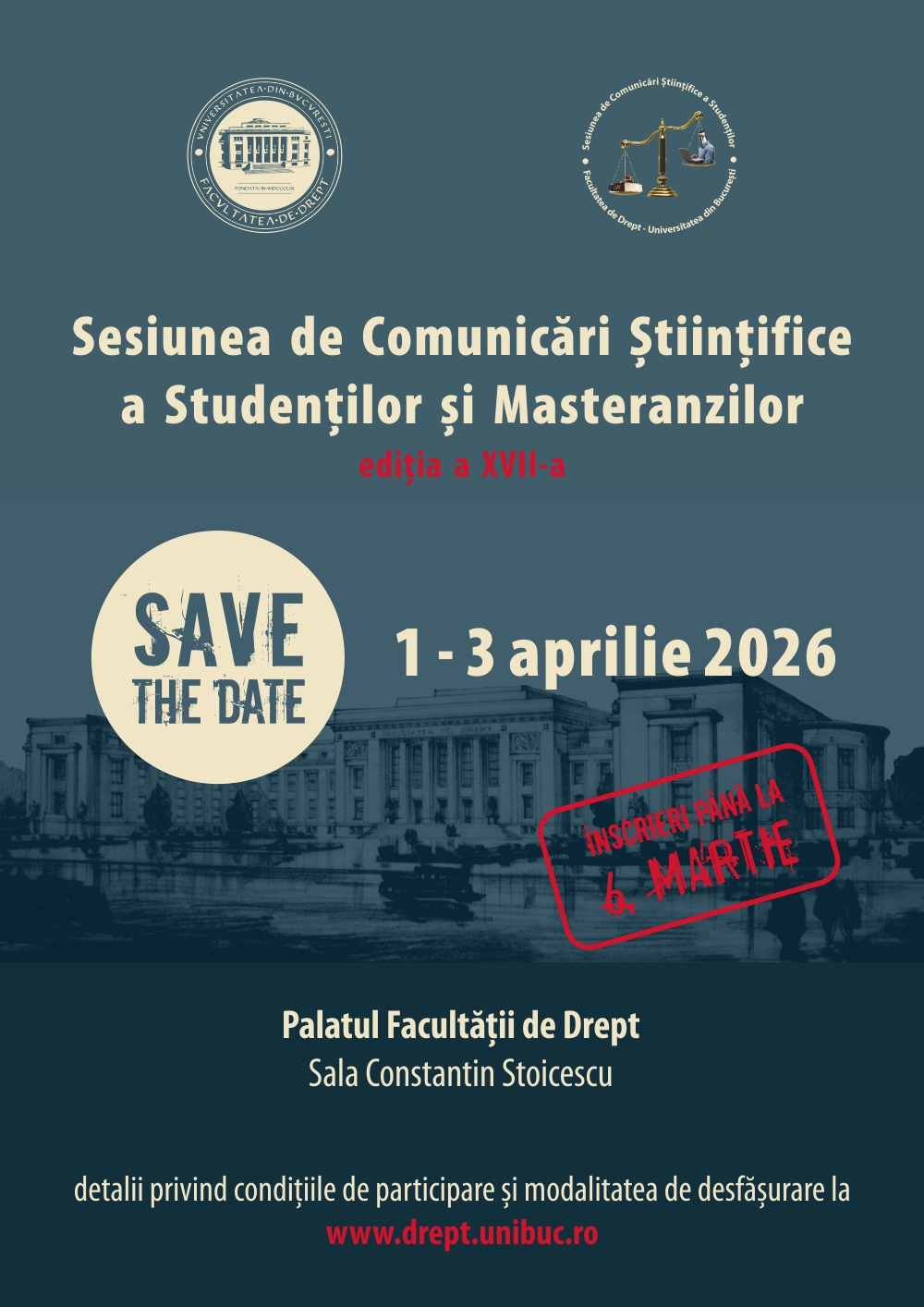 Ediția a XVII-a din anul universitar 2025-2026 a Sesiunii de Comunicări Științifice adresată studenților și masteranzilor Facultății de Drept, Universitatea din București (SCS) va avea loc în perioada 1-3 aprilie 2026.