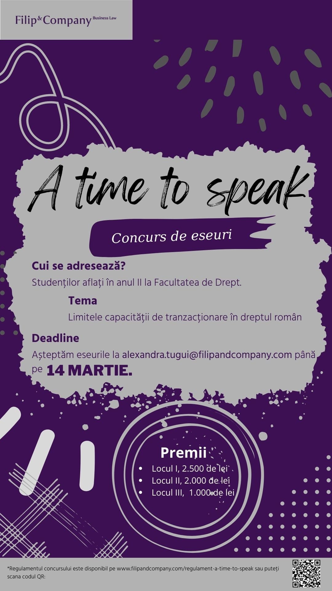 Dacă îți place să scrii, lasă-ne să te cunoaștem. Concursul de eseuri “A time to speak” revine cu o nouă ediție. Tema pe care v-o propunem anul acesta este Limitele capacității de tranzacționare în dreptul român. Ipoteza de la care vei porni în structurarea eseului este disponibila aici: https://filipandcompany.com/regulament-a-time-to-speak/
