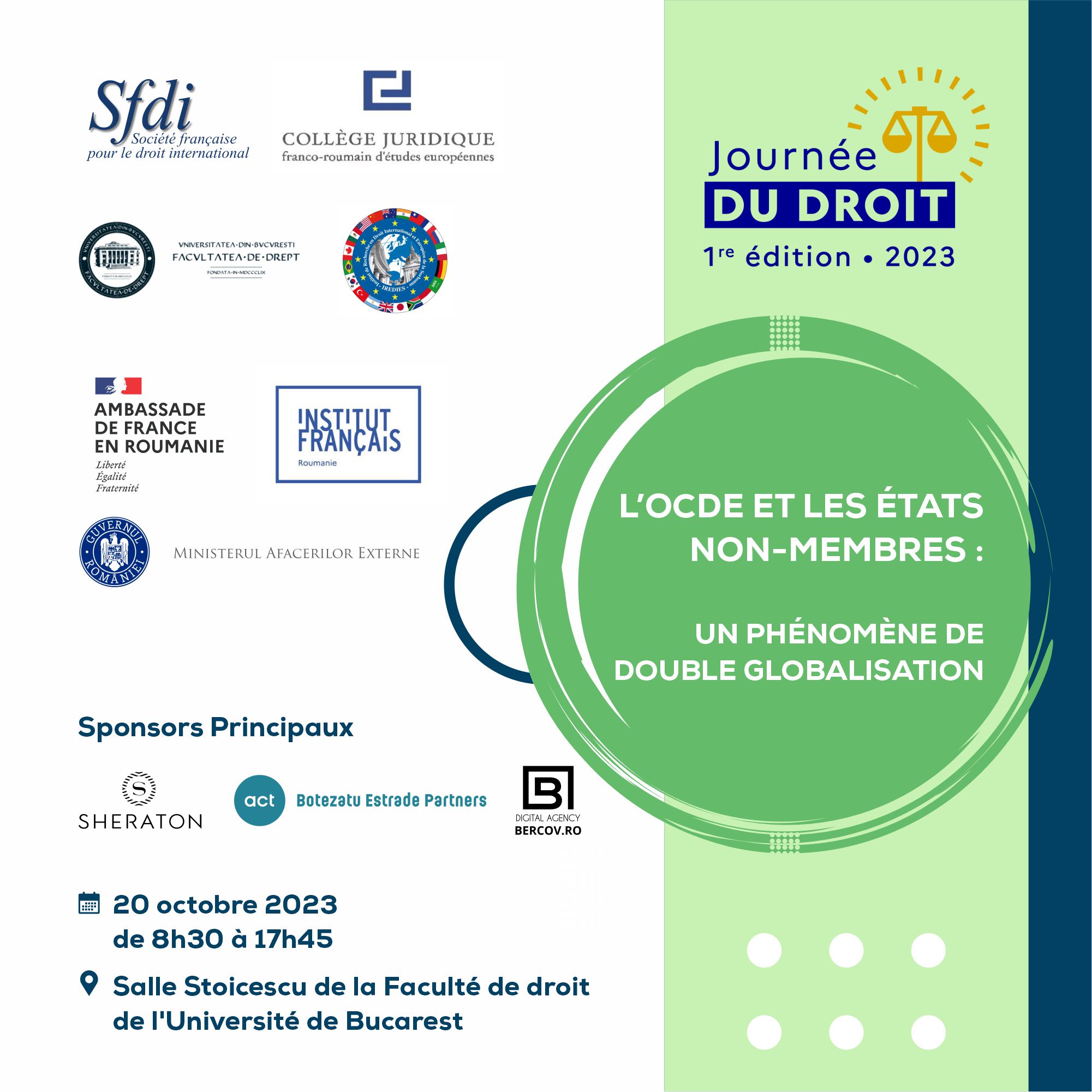 Cu ocazia primei ediții a Journée du droit, Facultatea de drept, Colegiul Juridic Franco-Român de Studii Europene, Societatea Franceză pentru Dreptul Internațional, Institutul de Cercetări în Dreptul Internațional și European, Ministerul Afacerilor Externe, Ambasada Franței în România și Institutul Francez din România au plăcerea să vă invite la Conferința L’OCDE et les États non-membres: un phénomène de double globalisation (OCDE și statele non membre: un fenomen de dublă globalizare), ce va avea loc vineri, 20 octombrie 2023, de la 8:45 la 17:45, în Sala Stoicescu.