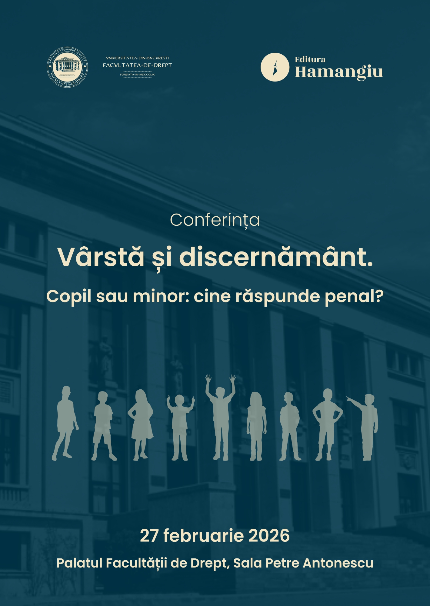 Facultatea de Drept, Universitatea din București și Editura Hamangiu organizează conferința cu tema „Vârstă și discernământ. Copil sau minor: cine răspunde penal?” la data de 27 februarie 2026, în Sala „Petre Antonescu”.
