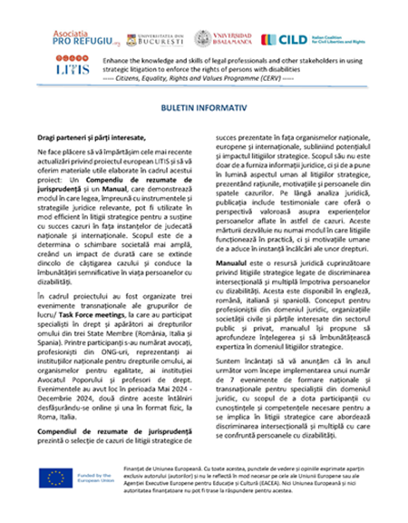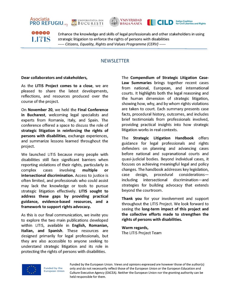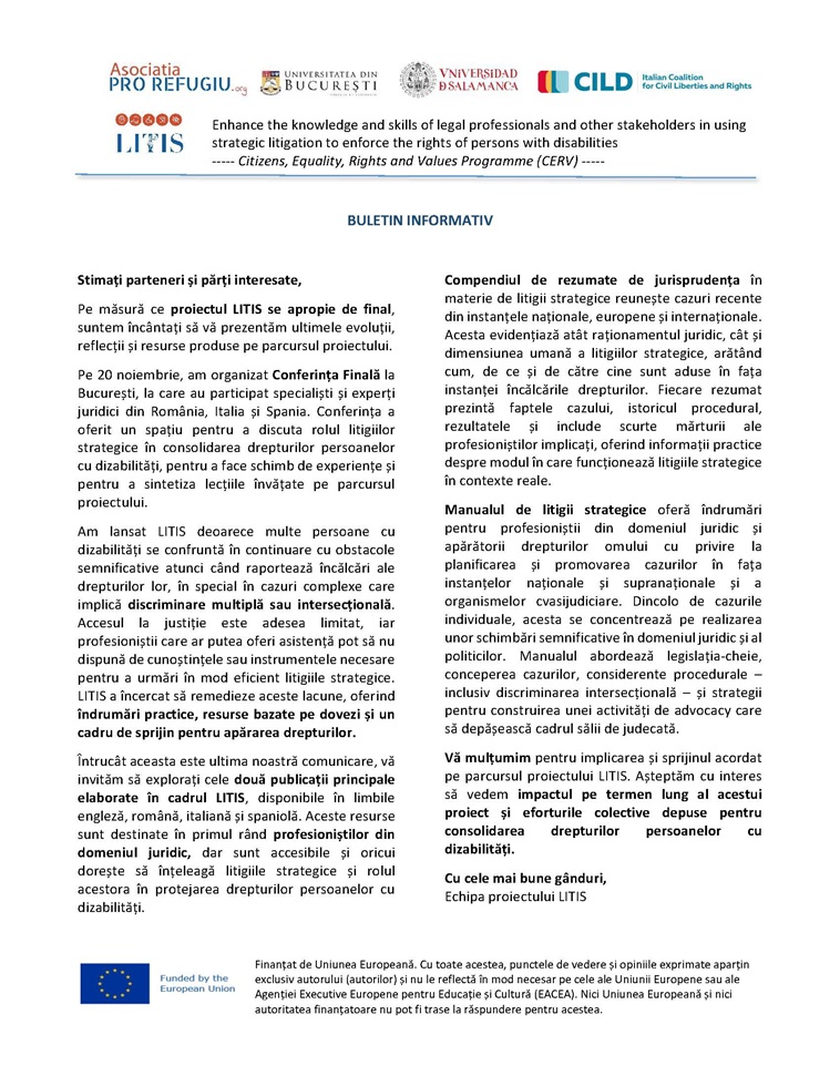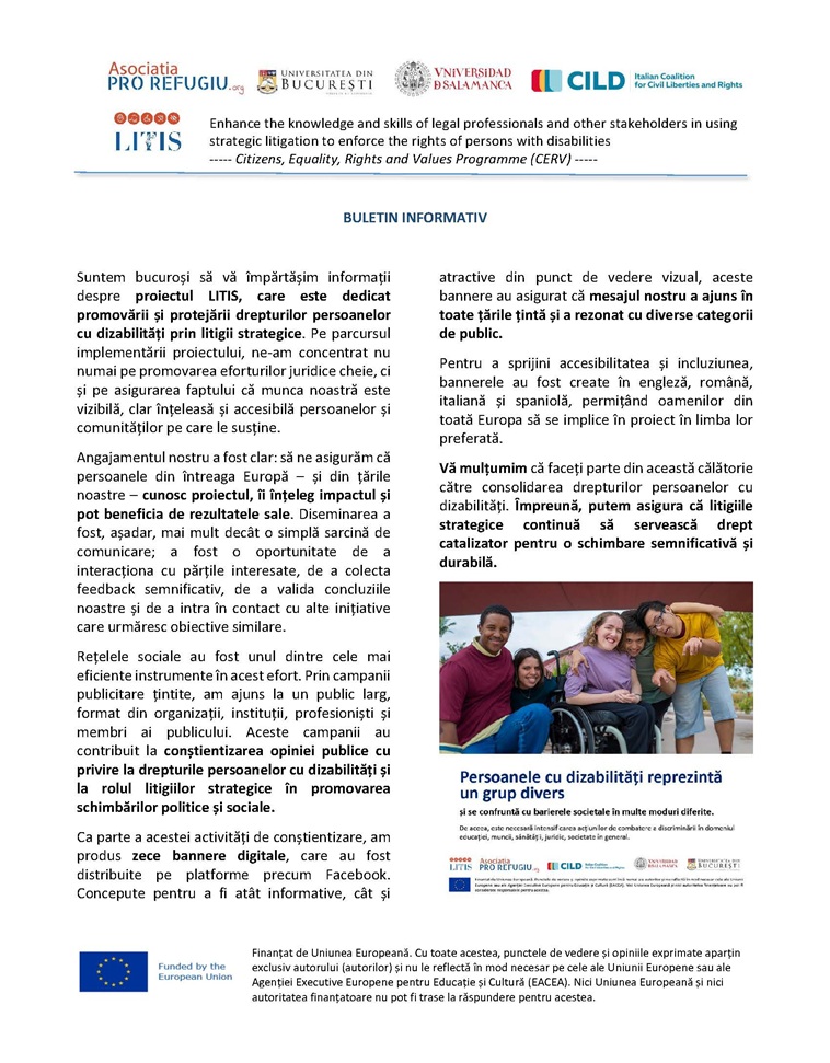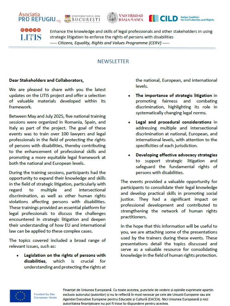 Proiectul LITIS: Centrul pentru studii în drept internațional și transnațional din cadrul Facultății de Drept a Universității din București este participant, alături de Asociația Pro Refugiu (România), Universitatea Salamanca (Spania) și Italian Coalition for Civil Liberties and Rights în cadrul proiectului transnațional Enhance the knowledge and skills of legal professionals and other stakeholders in using strategic litigation to enforce the rights of persons with disabilities (LITIS) care se va derula în perioada martie 2024 – decembrie 2025, cu sprijnul financiar al Programului Cetățeni, egalitate, drepturi și valori (CERV). În documentele atașate se regăsesc câteva informații despre activitatea recentă derulată în cadrul proiectului.
