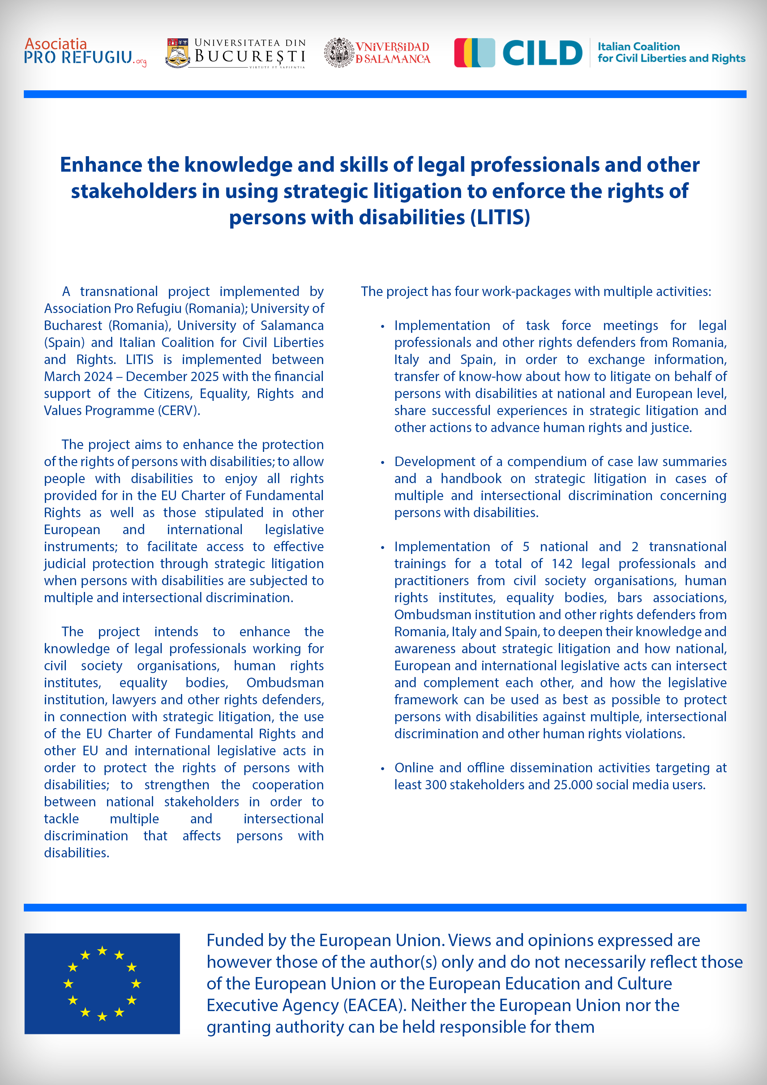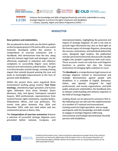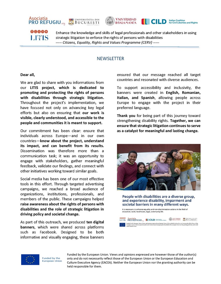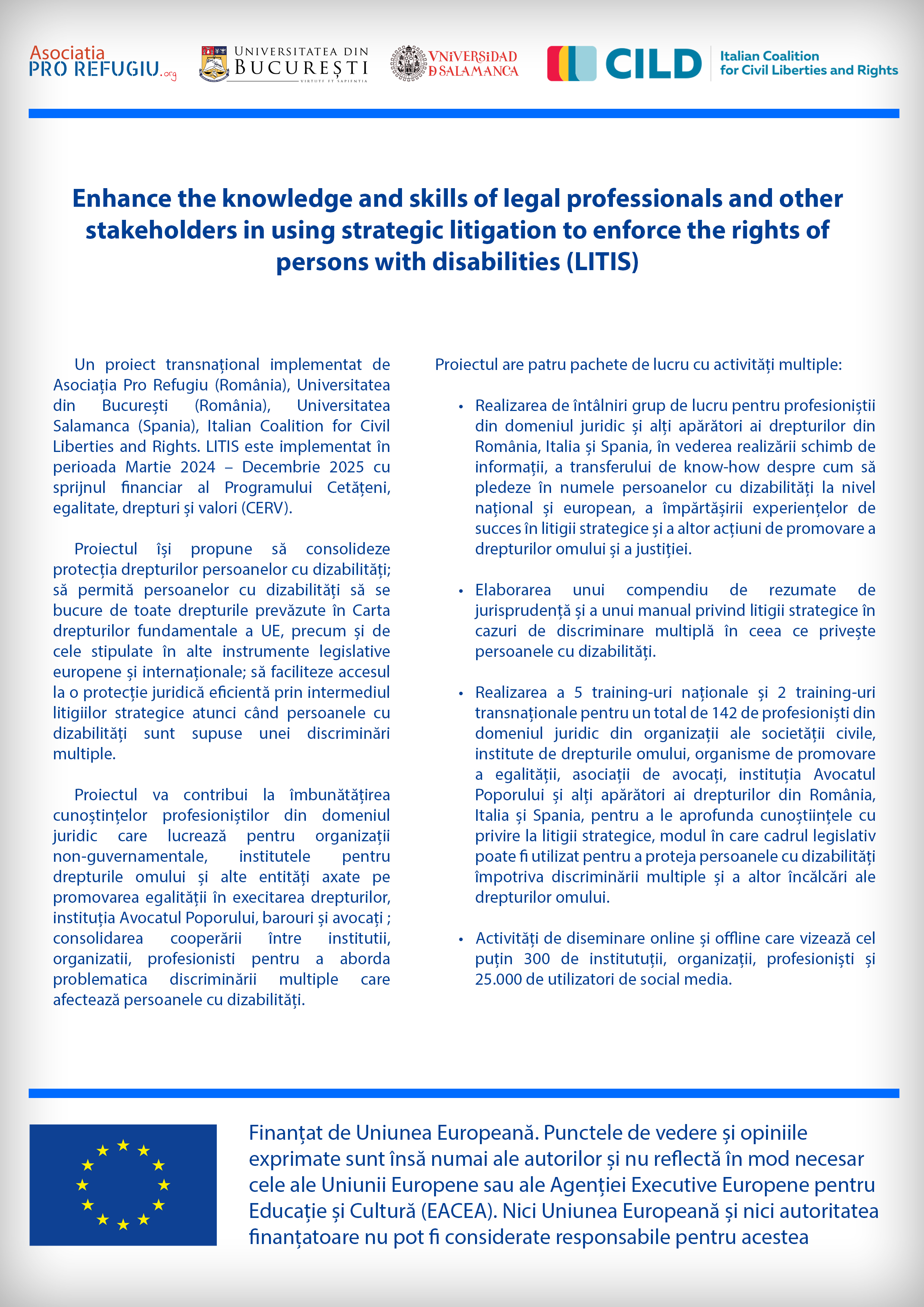 Proiectul LITIS: Centrul pentru studii în drept internațional și transnațional din cadrul Facultății de Drept a Universității din București este participant, alături de Asociația Pro Refugiu (România), Universitatea Salamanca (Spania) și Italian Coalition for Civil Liberties and Rights în cadrul proiectului transnațional Enhance the knowledge and skills of legal professionals and other stakeholders in using strategic litigation to enforce the rights of persons with disabilities (LITIS) care se va derula în perioada martie 2024 – decembrie 2025, cu sprijnul financiar al Programului Cetățeni, egalitate, drepturi și valori (CERV). În documentele atașate se regăsesc câteva informații despre activitatea recentă derulată în cadrul proiectului.
