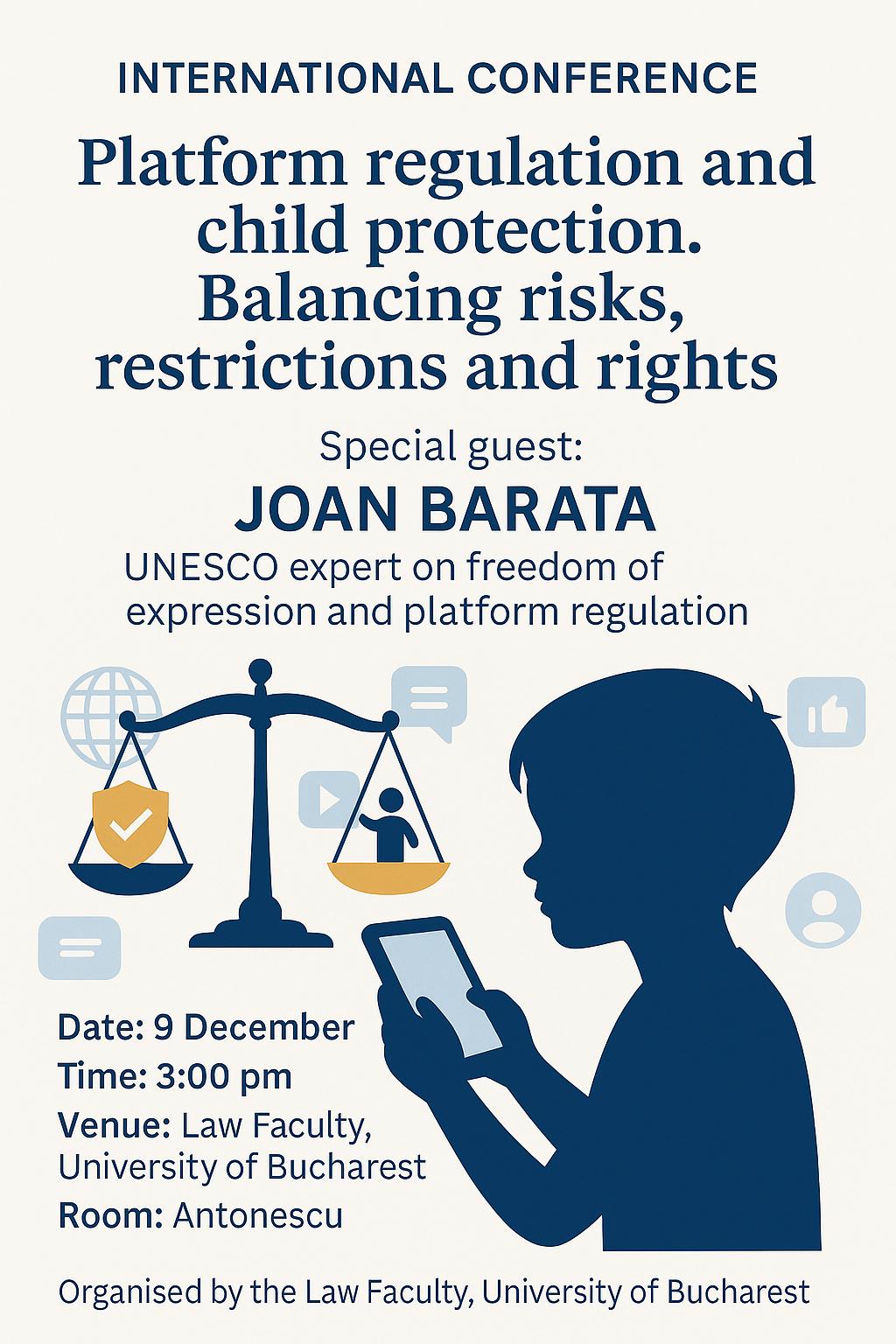 În data de 9 Decembrie 2025, ora 15.00, sala Petre Antonescu, va avea loc Conferința internațională cu tema-Platform regulation and child protection-balancing risks, restrictions and rights, avându-l ca invitat pe Joan Barata, UNESCO expert.